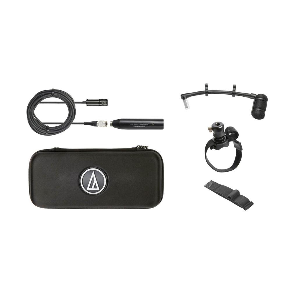 The microphone’s cardioid polar pattern isolates the instrument by reducing side and rear pickup, and the switchable 80 Hz high-pass filter on the in-line power module helps control undesired low-frequency noise. The system also includes an AT8468 violin mount with hook-and-loop fastener and a protective carrying case.