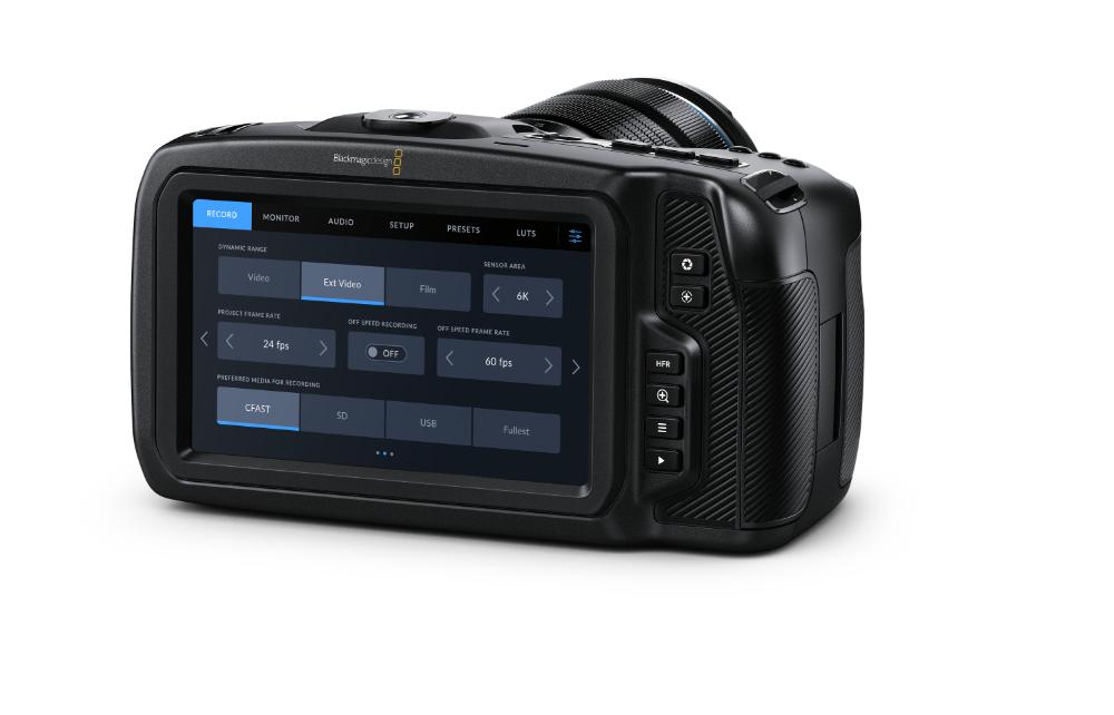 The Blackmagic Pocket Cinema Camera 6K Pro is an advanced technology, handheld 6K digital film camera with 6144 x 3456 Super 35 high resolution HDR sensor, dual native ISO, EF lens mount and direct recording to USB‑C disks! This powerful model adds an adjustable HDR touchscreen, built in ND filters, and a larger battery for longer run time. You can even add an optional OLED viewfinder!