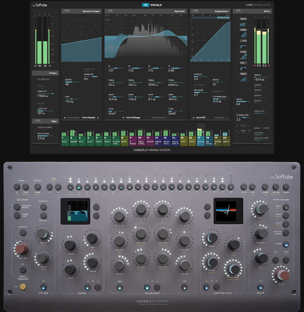 - Core Mixing Suite, featuring: Softube Tape/Preamp section; Shape: Transient Shaper plus new utility tools; 2 equalisers: passive vintage and precise modern; 3 compressors: based on FET Compressor Mk II, Bus Processor, and OPTO Compressor; Newly designed drive algorithm
