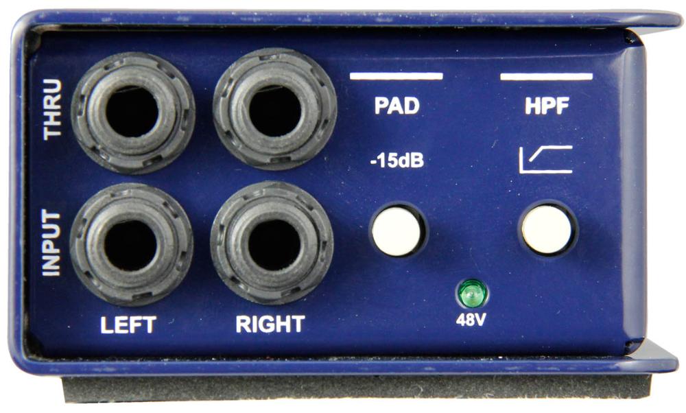 Inside, a unique switching power supply converts the 48 volt phantom to AC, increasing the headroom for improved signal handling and lower distortion. This results in an exceptionally linear frequency response that spans from 10Hz to 40kHz while being able to handle high output instruments without choking. In addition, a -15dB pad may be engaged for extreme signal handling. This is supplemented with a high-pass filter that gently rolls off low frequencies below 80Hz to clean up mud and excessive resonance. A side-access 180º polarity reverse aids when using the J48 Stereo with dual element pickups to either phase align the sources or eliminate acoustic hot spots that can cause feedback on stage.