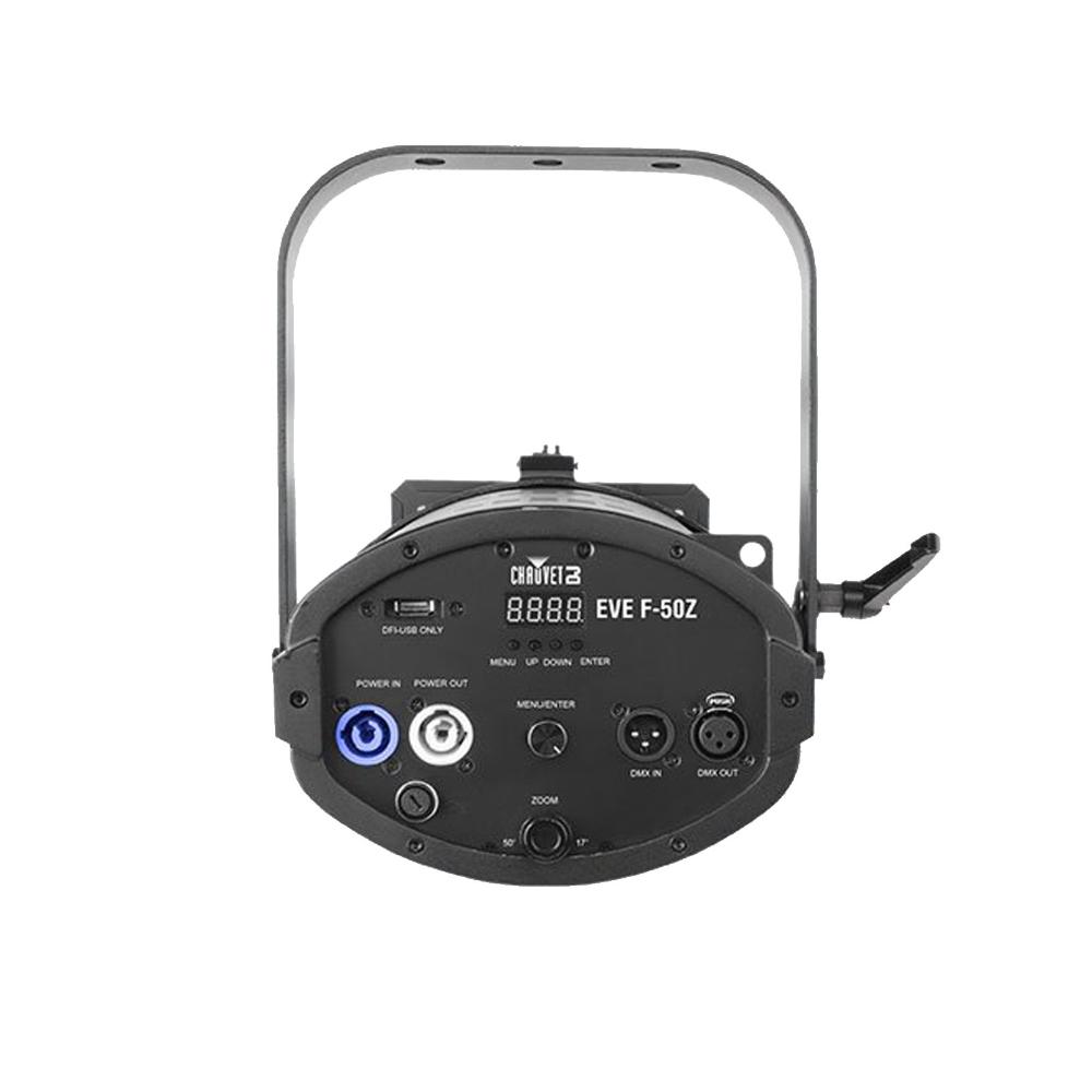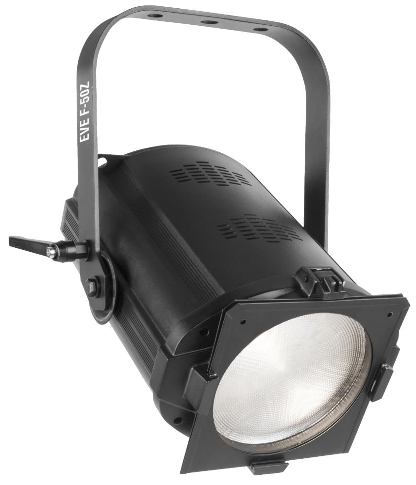 EVE F-50Z is an LED Fresnel fixture that shines a soft-edged, warm white spot and features D-Fi™ USB compatibility for wireless master/slave or DMX control. Manual zoom gives you the flexibility to project from any distance. You can operate EVE F-50Z in standalone mode eliminating the need for DMX control and you can save time running extension cords by power linking multiple units.