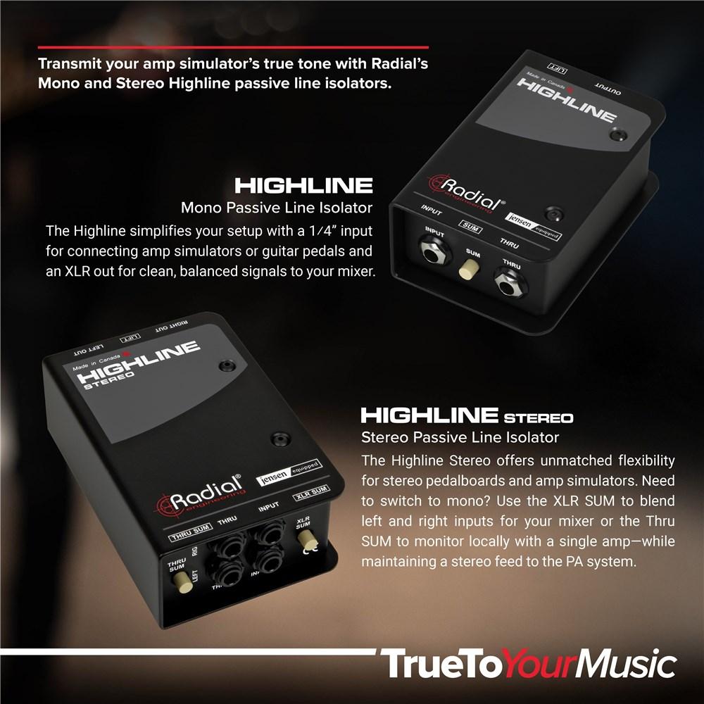 The Radial Highline Stereo Passive Line Isolator is designed for musicians using amp simulators, offering features like balanced XLR outputs, phantom power protection, and a choice of stereo or mono output configuration. Features a Jensen transformer.