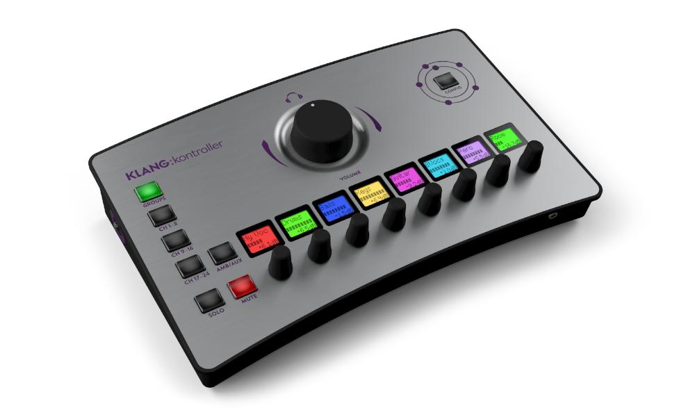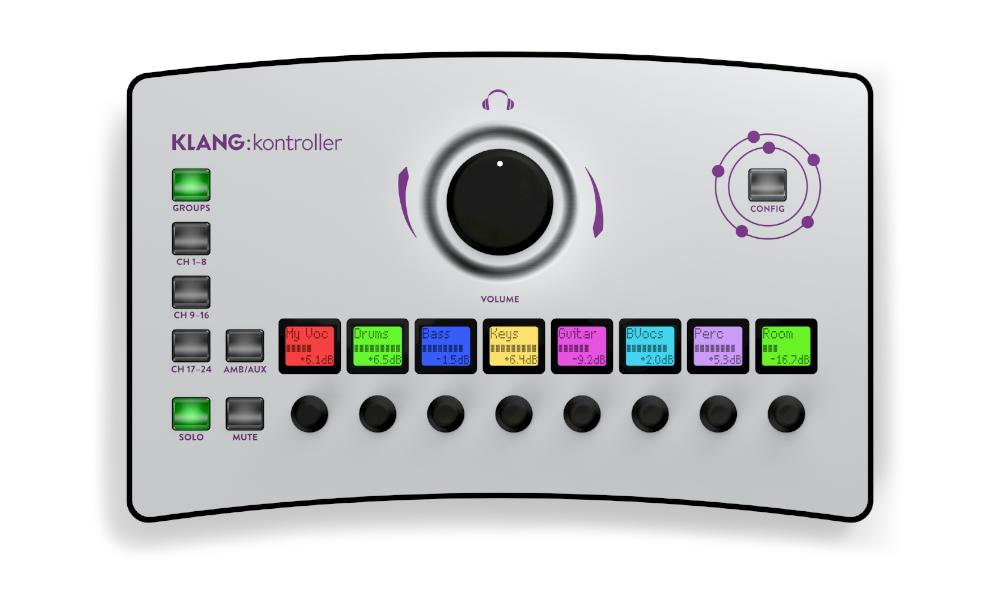 Being compatible with all KLANG Immersive In-Ear Mixing Processors, KLANG:kontroller is the first hardware controller with full control right at your fingertips. It delivers fast tactile user control of channels, groups and immersive mixing via an intuitive interface. The times of outdated name tags and dialling through all channels are over with 8 displays providing clear channel names and colour coding.