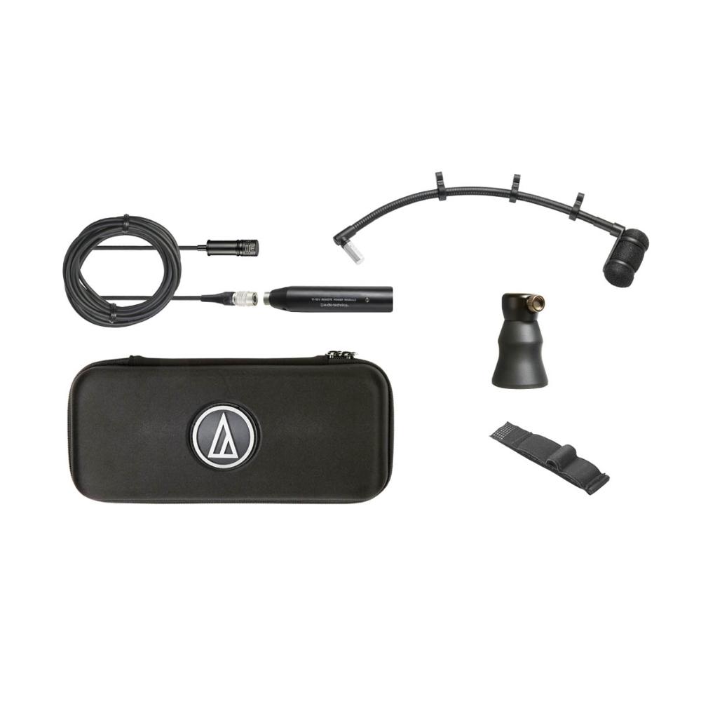 The microphone’s cardioid polar pattern isolates the instrument by reducing side and rear pickup, and the switchable 80 Hz high-pass filter on the in-line power module helps control undesired low-frequency noise. The system also includes an AT8468 violin mount with hook-and-loop fastener and a protective carrying case.