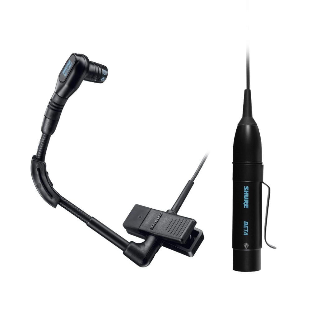 The BETA®98H/C and the wireless version WB98H/C are premium cardioid condenser instrument microphones that clamp onto the bell of wind instruments or onto the rim of percussion instruments. The integrated gooseneck and ratcheting swivel joint allows the mic to be easily positioned and secured, and an isolation shock-mount reduces the transmission of instrument 'key noise' and other mechanical noise. A gooseneck angle brace is included to provide better retention of the microphone placement during more active performances.