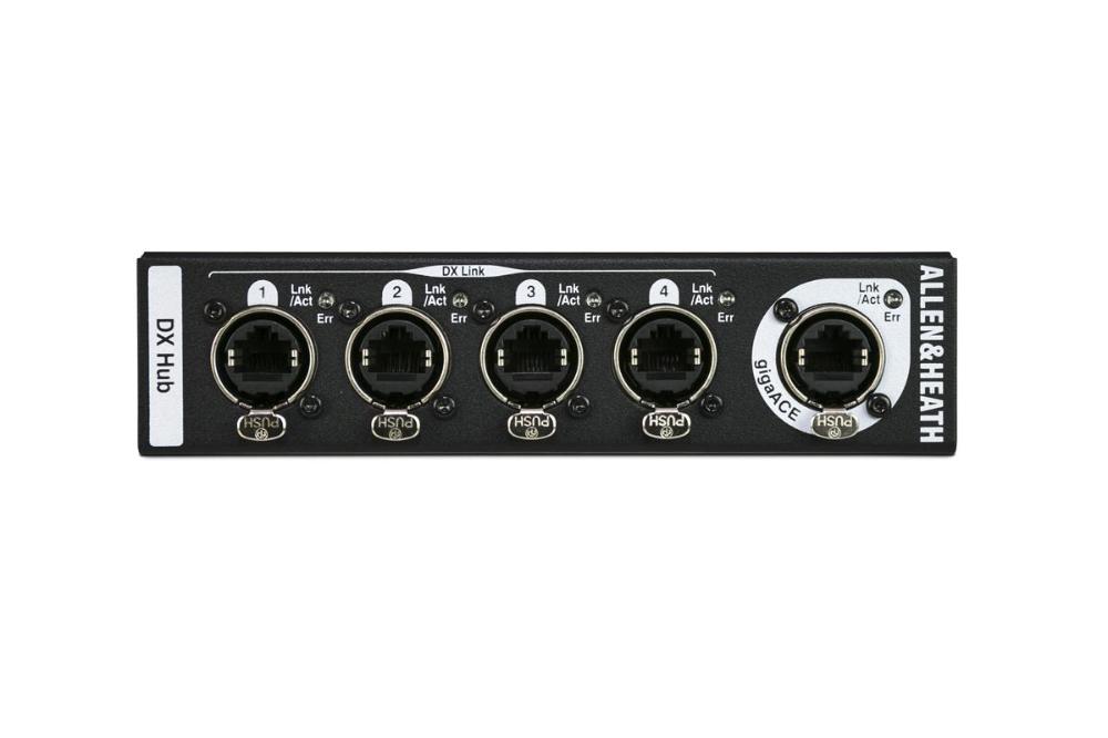 The DX Hub is a remote audio networking hub that can be connected to any Allen & Heath AHM-64, SQ or Avantis mixer via SLink, or any Avantis mixer or dLive system fitted with a gigaACE I/O module. It provides 4 DX Link ports each carrying 32×32 channels of 96kHz audio, that can be used to connect to DX expander units.