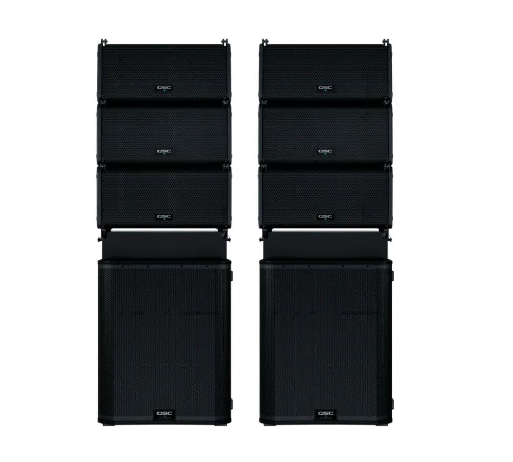 QSC L-Class Powered Line array, ground stack system with three LA108 and one LS118 per side. Contact our sales team today for all your QSC L Class needs!