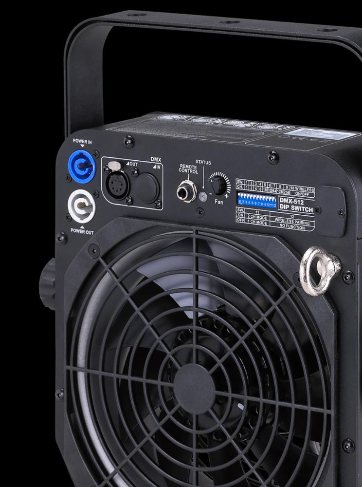 The AF3 is a small multi purpose stage fan featuring 4 control options, linear output control, low power consumption, adjustable blowing direction all in a durable metal housing. It has onboard DMX control as well as a manual control knob. Optional wired and wireless controllers to cope with diverse requirements. The total power consumption is a mere 100W and the bracket enables various output directions within 90 degrees while hung or laced on the floor.