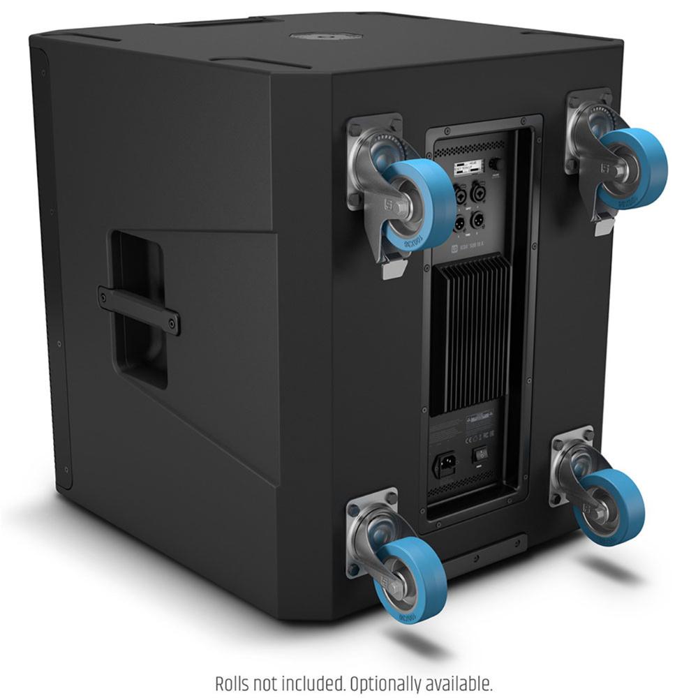 The rugged housings made of 18 mm laminated wood can be stacked, while the M20 thread on top lets you mount the main speakers using a distance pole. Transport is simplified by mounting rollers to the rear. Corner protectors guard the edges during setup. To keep the ICOA SUB from slipping out of your hands, its four aluminium grips are covered in rubber.