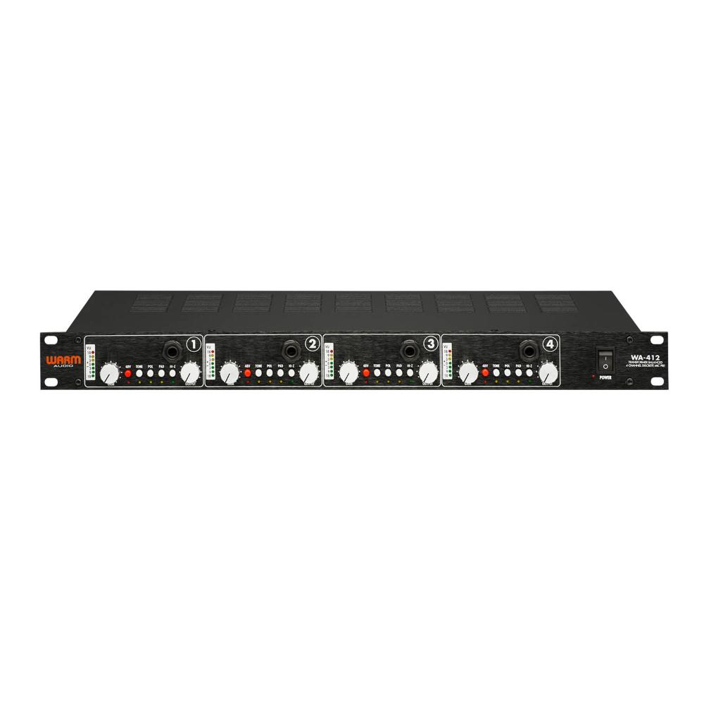 The WA-412 provides 4 channels of classic American console preamps in a sleek 1RU design. This style of preamp is often referred to as "the sound of Rock n' Roll" for its BIG punchy low end and smooth open top end. The price/performance ratio of the WA-412 is almost unfathomable to the experienced studio engineer who has possibly paid much more for preamps of this style during their career. Featuring fully discrete socketed 6-pin opamps and custom wound Altran USA input and output transformers, the WA-412 leaves nothing to be desired. If you are looking for multiple channels of world class tone in an affordable package, the WA-412 is the right choice for you.