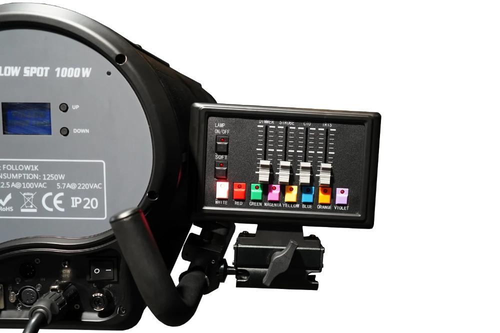 1000W LED Followspot with 3.5-7 Degree Manual Zoom, True1 input, 5 pin DMX in/out + 4 Pin Remote, Road Case, Kupo Tripod Stand and Gel Frame Holder