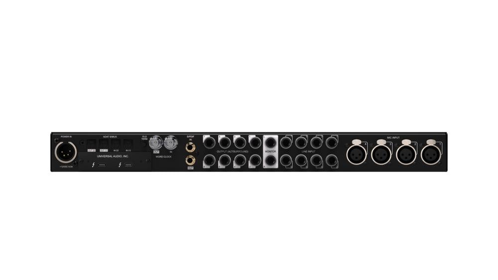 - Four Unison™ mic preamps, two Hi-Z instrument inputs, eight 1/4 line inputs, two optical Toslink I/O (ADAT S/MUX), RCA coaxial I/O (S/PDIF), word clock I/O (BNC)