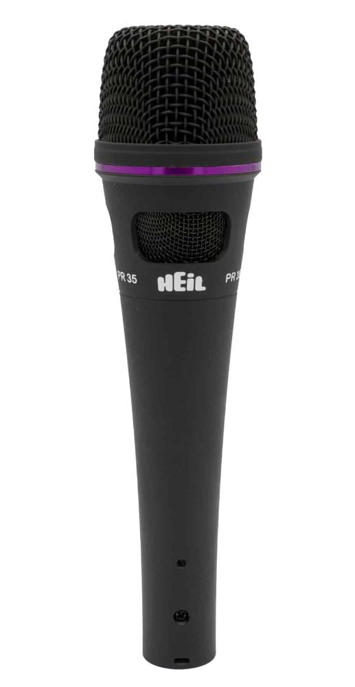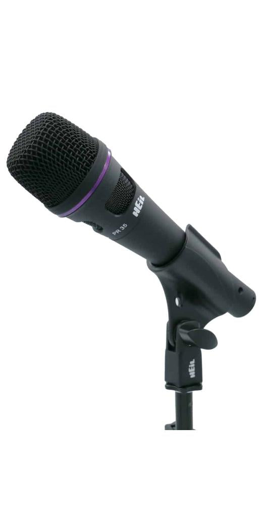The Heil PR 35 is a dynamic microphone designed for vocal live sound reinforcement and recording. The PR 35 has a characteristic smooth frequency response, providing a warm and lush presence to vocals of all kinds. The dynamic element of the PR 35 is suspended in a floating mount, allowing air to move around the element and preserving articulate sound when the mic is cupped. Like all Heil mics, the PR 35 has excellent rear noise rejection, even in high stage volume situations. The PR 35 features a low-end roll-off switch for vocalists looking to tailor their response. Ready for stage use, the PR 35 has a durable rubberized exterior coating for added protection and grip.