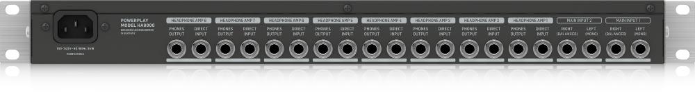 On the back panel you‘ll find an additional ¼" Phones Output per channel, allowing up to 16 pairs of headphones to listen to 8 separate mixes at once. The back panel also provides access to the HA8000’s per-channel Direct Inputs and the Main 1 & 2 Inputs.