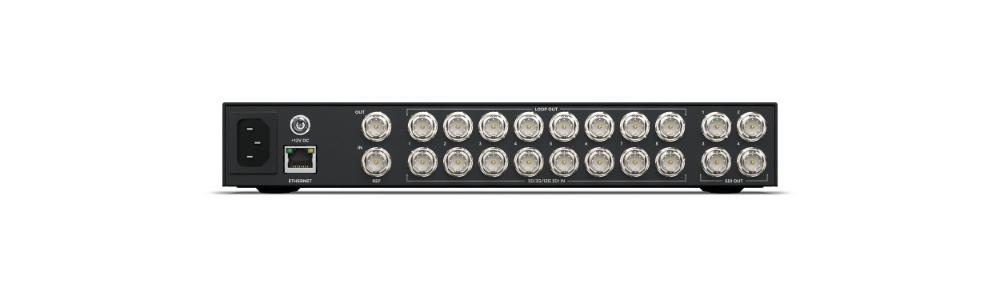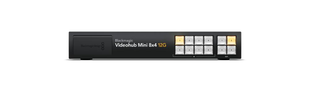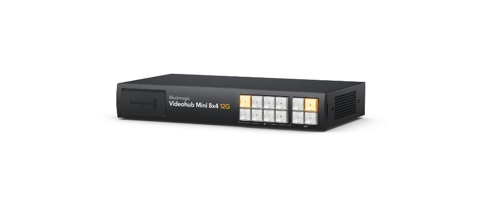 Blackmagic Videohub Mini 8x4 12G is a compact zero latency video router that supports any combination of SD, HD and Ultra HD on the router at the same time. It has 8 12G-SDI inputs and 4 12G-SDI outputs plus reference connections for locking clean switch outputs in a compact 2/3 rack width size. The front panel control panel lets you quickly route a video connection and even includes an emergency 12G-SDI connection for patching in external gear and USB-C webcam video out. It also features SDI re-clocking, external Ethernet control and supports all SDI video standards up to 2160p60.