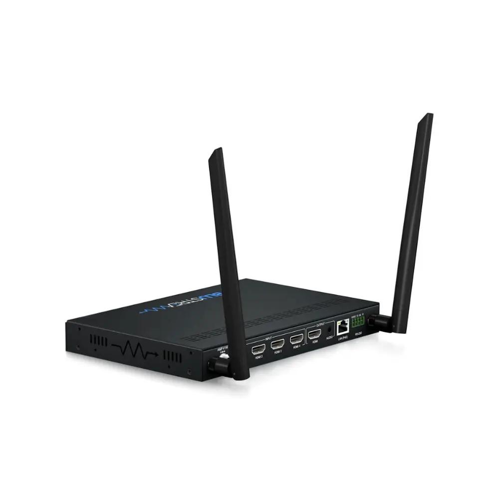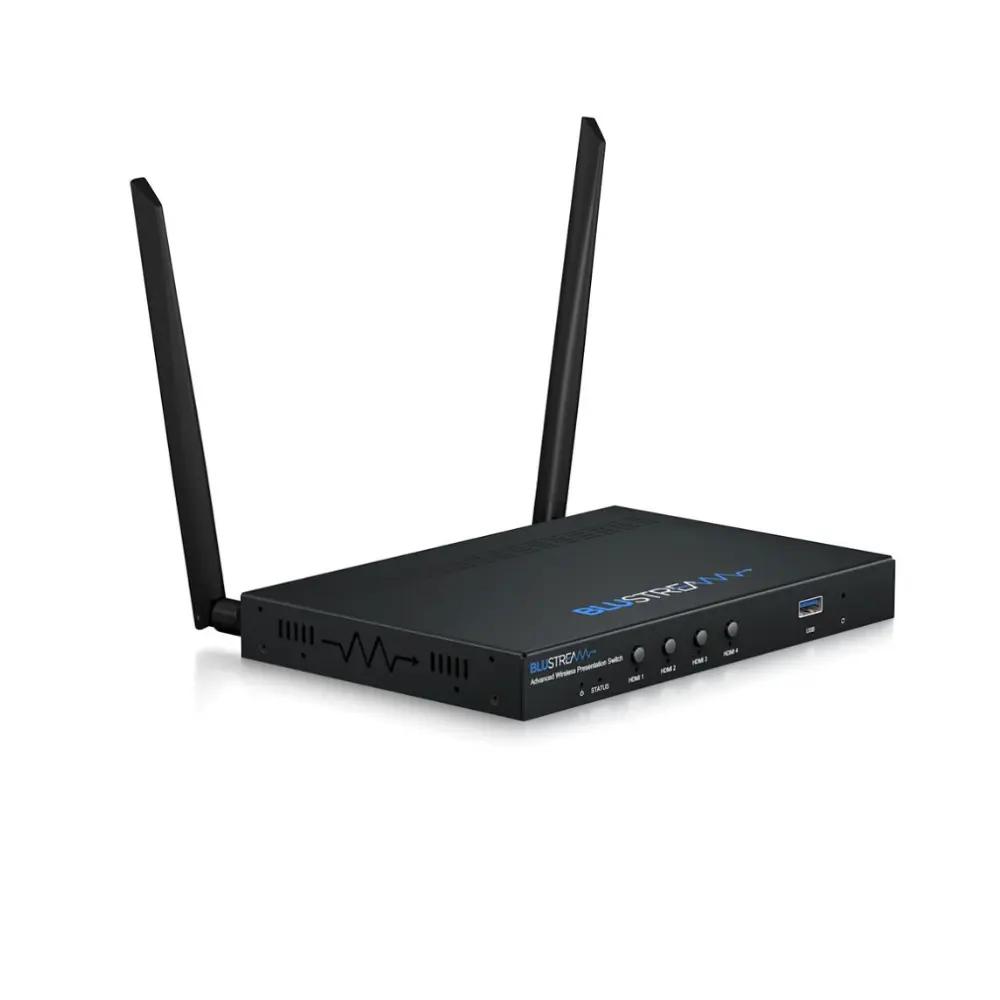 The Blustream AMF41W is an advanced 4K multi-format presentation switch featuring 4 x HDMI, AirPlay and Miracast® inputs to a single HDMI output. This presentation switch provides enhanced features including localised 2.4/5G WiFi hotspot, seamless switching, multi-view presentation, video scaling, and web-GUI for control and configuration. It features auto display control via RS-232, manual or automated source selection and control via front panel, and TCP/IP.
