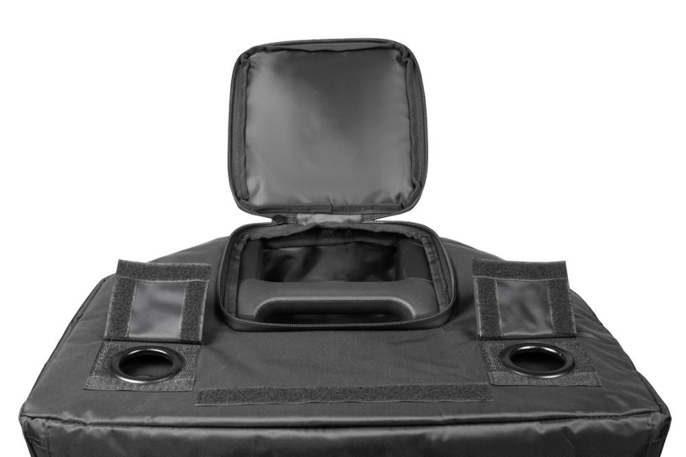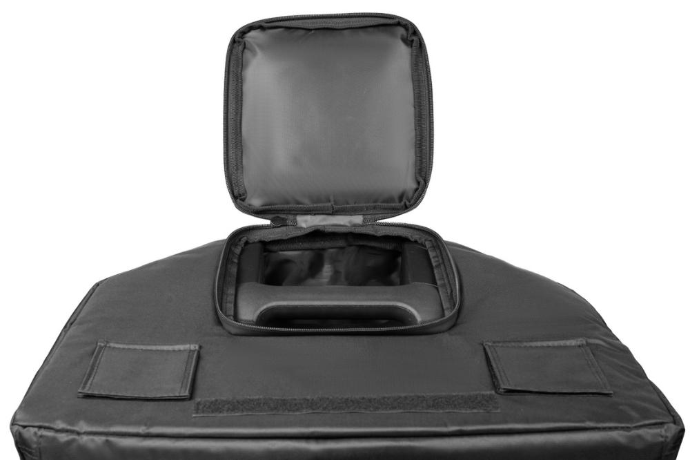 - Roll-Up, Hook-and-Loop Cover Flap Exposes Mesh Speaker Grille & Zippers Down When Not in Use