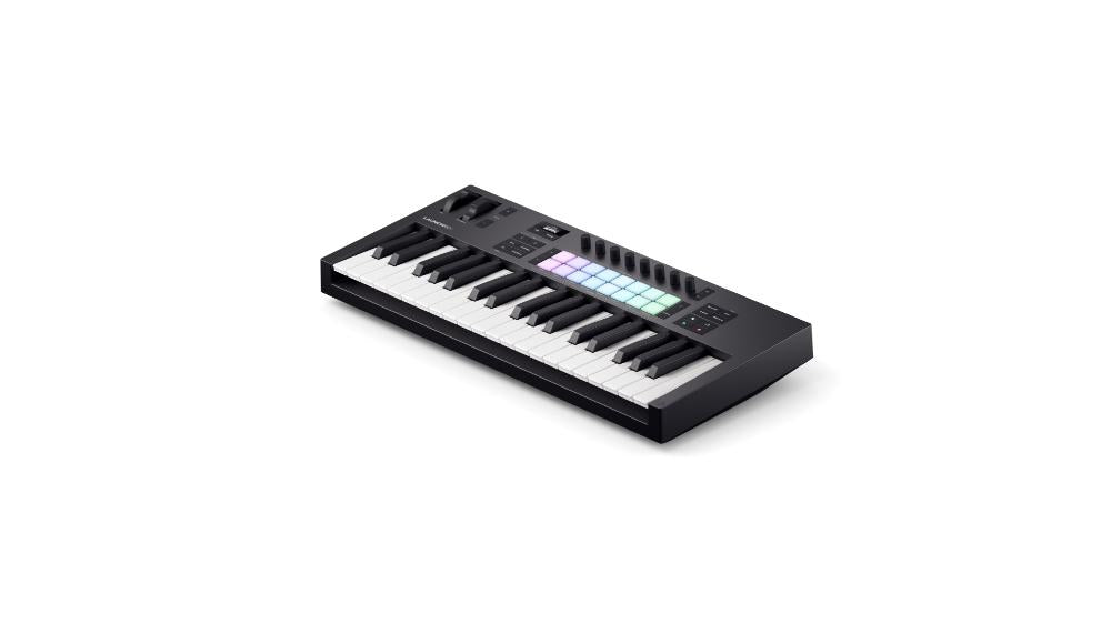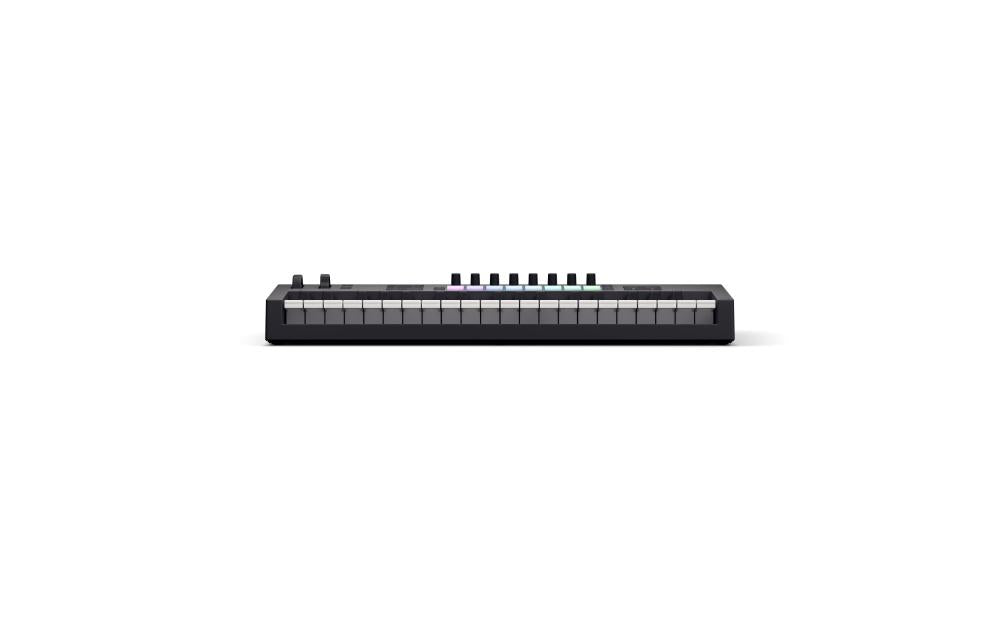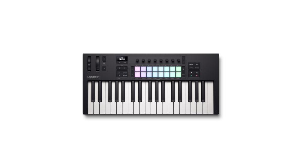Launchkey 37 is a powerful DAW controller with a synth-style keyboard, eight continuous encoders, and 16 velocity sensitive pads for playing drums, instruments, and launching clips; it also includes creative Chord and Scale modes that work with the OLED display to make staying in key effortless.