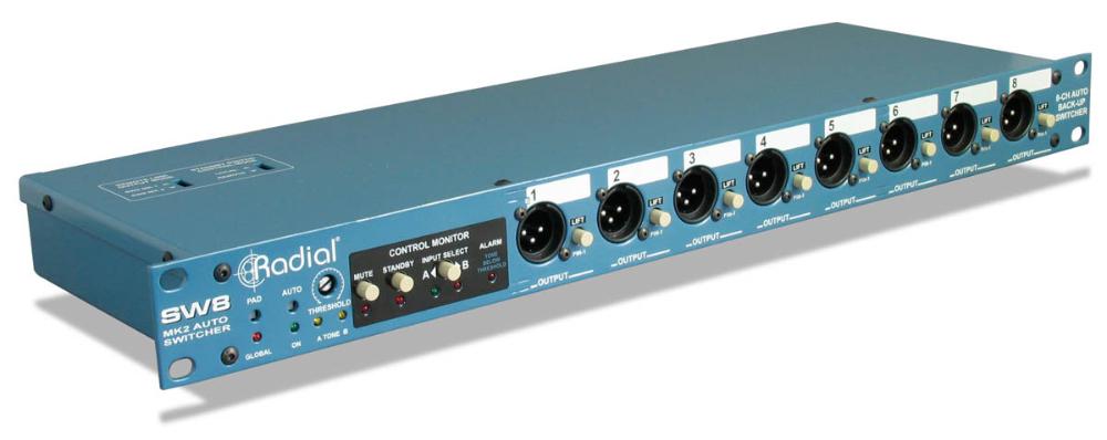 The Radial SW8 is an 8 channel auto-switcher that allows you to set up a redundant backup system by automatically switching between two sources such as a pair of digital recorders, computers or network systems.