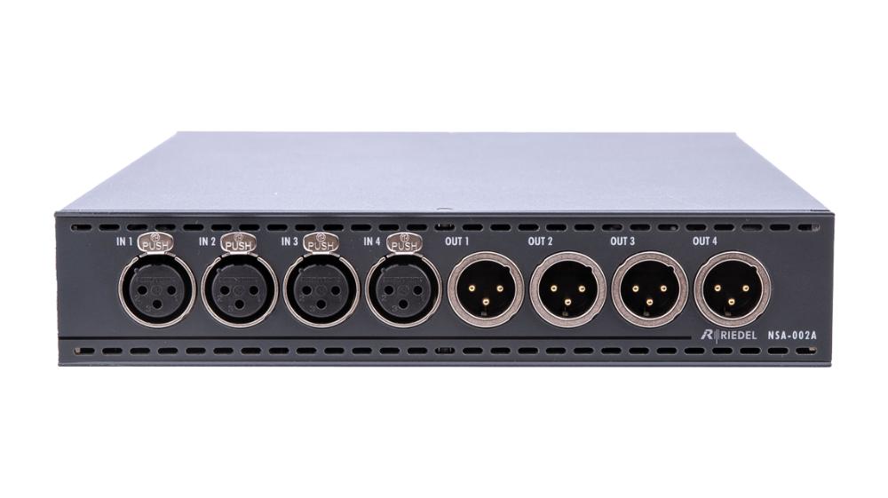 Riedel’s NSA-002A Network Stream Adapter handles all bidirectional signal conversion between analog signals and AES67 .