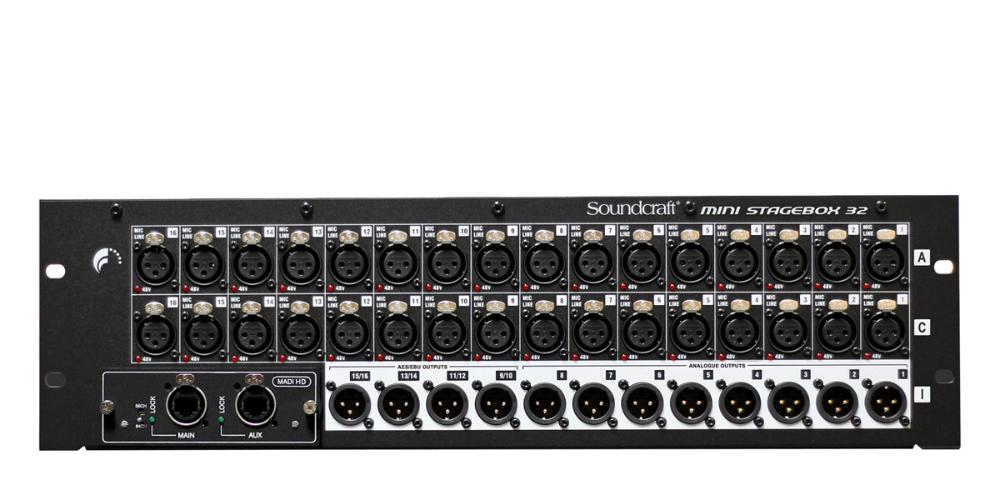 The Mini Stagebox range from Soundcraft provides a simple solution to stage connectivity for you Soundcraft Mixer utilizing Cat5e cable for a fast and convenient setup. The Mini Stagebox 32 model providing 32 analogue inputs and 16 line outputs making a 32 x 16 matrix. They connect to any of the Soundcraft Si Expression, Si Compact, Si Performer, Si Series and Vi Series consoles via a MADI card fitted to the option card slot. The Mini Stagebox models contain an integral PSU so are completely self-contained and sit comfortably stage-side.